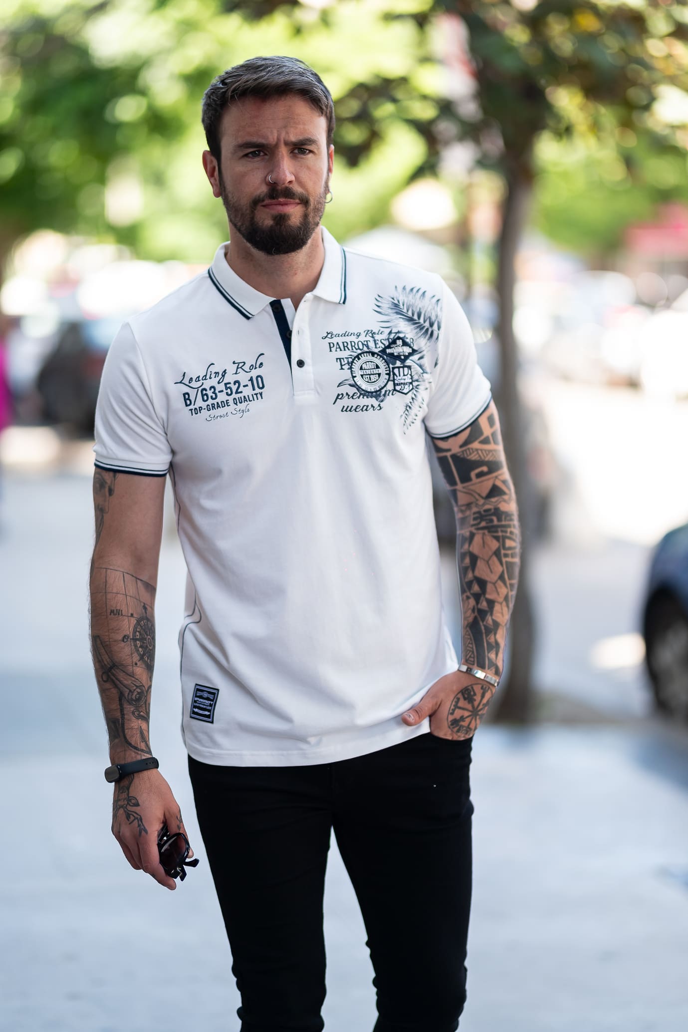 Polera de cuello tipo piqué con un diseño sumamente atractivo que fusiona las texturas de estampado y bordado.